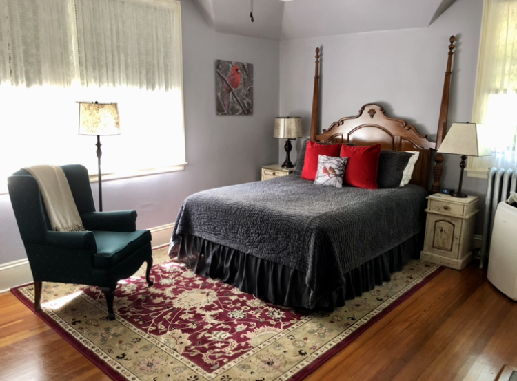 Soft lavender gray walls and a plush red Oriental carpet offset a beautiful mahogany four-poster, Chippendale-style, queen-size bed in this sunlit second-floor room. A cozy gray velvet quilt and soft, plump pillows complete the picture. Against one wall, the mirror of a large antique oak dresser reflects the flickering light of the original coal fireplace, which has been retrofitted with gas logs for your convenience. A deep, jewel-tone green wing chair invites you to rest.