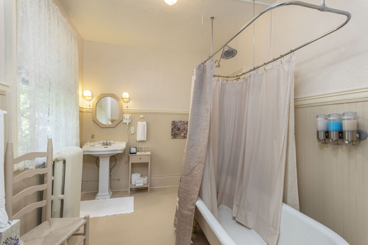 Named for the framed section of the original 1901 wallpaper over the lovely gas fireplace, the Hummingbird Room has a beautiful hand-crafted wrought iron king bed, a soft green oriental carpet, and the original claw-foot tub and shower in the private bath. You will feel like royalty as you enjoy the plush comfortable pillow bedecked bed and the heart-pine floors that glow in the light from the original fireplace. The largest of our guest rooms on the second floor, the Hummingbird Room is richly furnished with antiques and cozy chairs. It contains plenty of modern comforts as well as everything you need to relax and enjoy the pleasures of this gorgeous room. Please note that the claw foot tub is deep, and if you are a person with limited mobility, this room might not be suitable for you.
